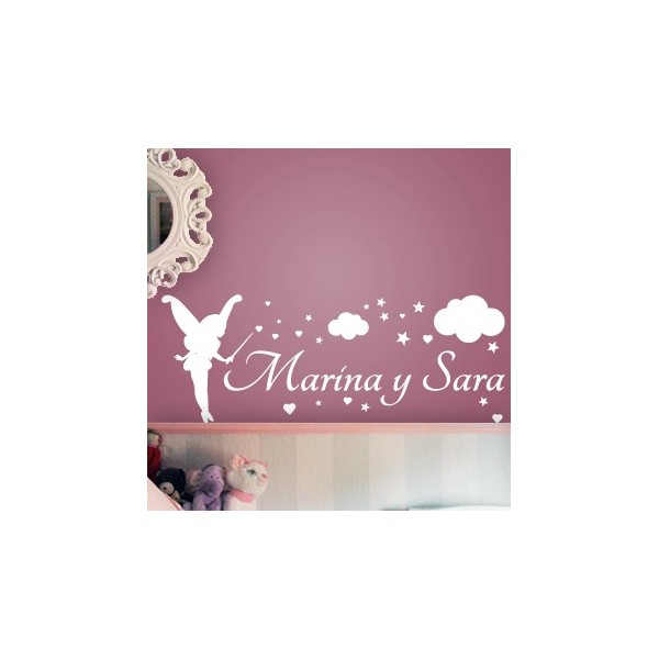 Los colores de los vinilos decorativos con los nombres Marina y Sara con estrellas, nubes y un hada que aparecen en está simulación son una aproximación a su color real, varían en función de la calibración de su monitor.