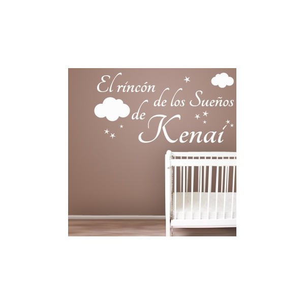 Vinilos decorativos con nombres con la frase "El Rincón de los Sueños de Kenai" y nubes y estrellas para decoración de paredes de forma original, recomendado para superficies lisas. Son muy sencillos de colocar, y la colocación es muy limpia y rápida.