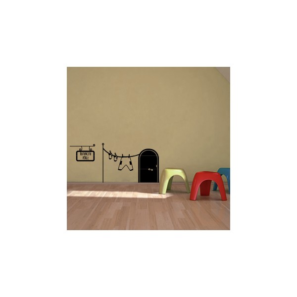 Vinilos infantiles del Ratoncito Pérez con la puerta de su casa, su nombre y su ropa tendida, para decoración de interiores y paredes, recomendado para superficies lisas. Son muy sencillos de colocar, y la colocación es muy limpia y rápida.