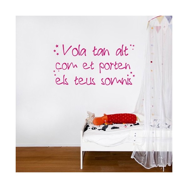 Vinilos decorativos con la frase en valenciano "Vola tan alt com et porten els teus somnis" con estrellitas para decoración de paredes de forma original, recomendado para superficies lisas. Son muy sencillos de colocar, y la colocación es muy limpia y rápida.