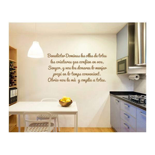 Vinilo decorativo con texto con la frase "Benedicter Dominus les ollas de totes les criatures que confien en vos, Senyor..." para decoración de interiores y paredes, recomendado para superficies lisas. Son muy sencillos de colocar, y la colocación es muy limpia y rápida.