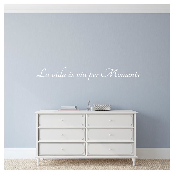 Vinilos con frase "La vida és viu per Moments". Pegatinas o stickers de paredes con la frase "La vida es viu per Moments".