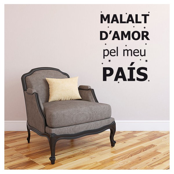 Vinilos decorativos con la frase en catalán "Malalt d'amor del mes país" para decoración de paredes de forma original, recomendado para superficies lisas. Son muy sencillos de colocar, y la colocación es muy limpia y rápida.