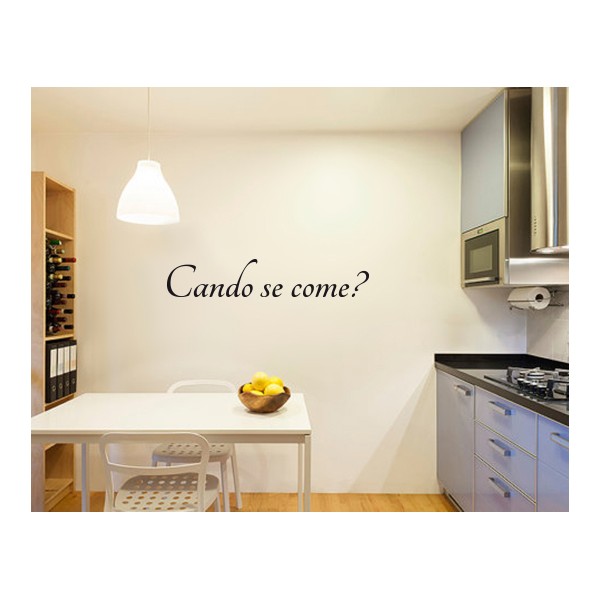 Vinilos decorativos con la frase en gallego "Cando se come?", para decoración de interiores y paredes, recomendado para superficies lisas. Son muy sencillos de colocar, y la colocación es muy limpia y rápida.
