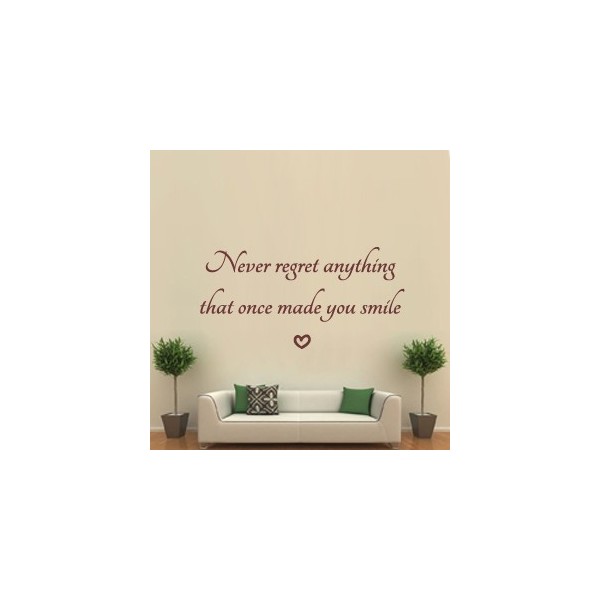 Vinilos decorativos con textos, con la frase en inglés "never regret anything that made you smile" para decoracion de paredes de forma original, recomendado para superficies lisas. Son muy sencillos de colocar, y la colocación es muy limpia y rápida.