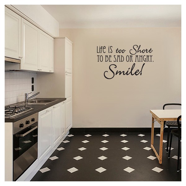 Vinilos decorativos con texto con frase en inglés "Life is too short to be sad or angry. Smile!"en formato horizontal, para decoración de interiores y paredes, recomendado para superficies lisas. Son muy sencillos de colocar, y la colocación es muy limpia y rápida.
