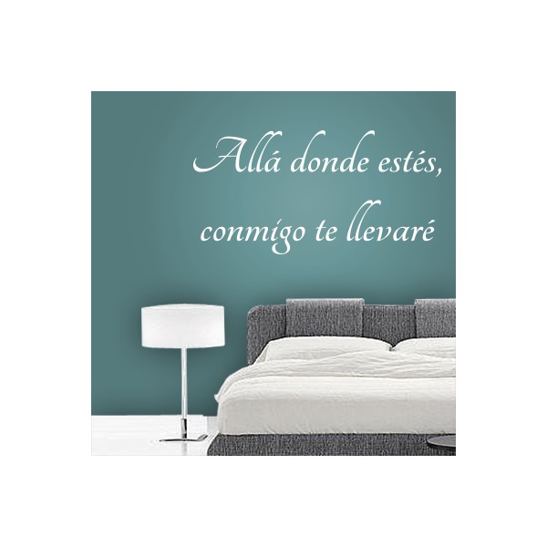 Vinilos decorativos con la frase "Allá donde estés, conmigo te llevaré", para decoración de interiores y paredes, recomendado para superficies lisas. Son muy sencillos de colocar, y la colocación es muy limpia y rápida.