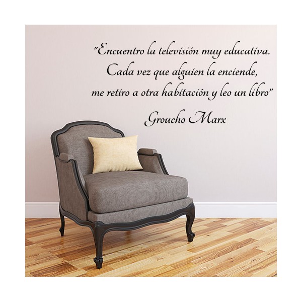 Los vinilos decorativos de texto con la frase "Encuentro la televisión muy educativa. Cada vez que alguien la enciende, me retiro a otra habitación y leo un libro” - Groucho Marx son una muy buena opción para personalizar tus paredes y añadir un mensaje y darle un toque especial al ambiente que te rodea.