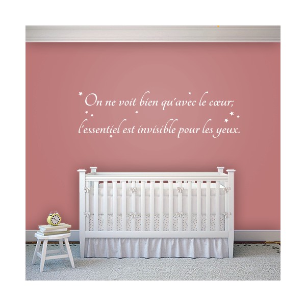 Las pegatinas de pared con frase infantil en francés "On ne voit bien qu'avec le cœur ; l'essentiel est invisible pour les yeux" son una muy buena opción para personalizar tus paredes y añadir mensajes, ideas, frases célebres o poemas y darle un toque especial al ambiente que te rodea, en este caso, con una frase infantil muy original.