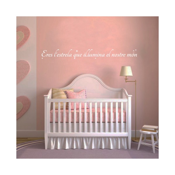 Las pegatinas de pared con frase infantil en valenciano "Eres l'estrela que il.lumina en nostre món" son una muy buena opción para personalizar tus paredes y añadir mensajes, ideas, frases célebres o poemas y darle un toque especial al ambiente que te rodea, en este caso, con una frase infantil muy original: "Eres l'estrela que il.lumina en nostre món"