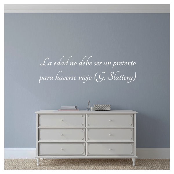 Vinilos con frase "La edad no debe ser un pretexto para hacerse viejo (G. Slattery)" para decoración de interiores y paredes, recomendado para superficies lisas. Son muy sencillos de colocar, y la colocación es muy limpia y rápida.