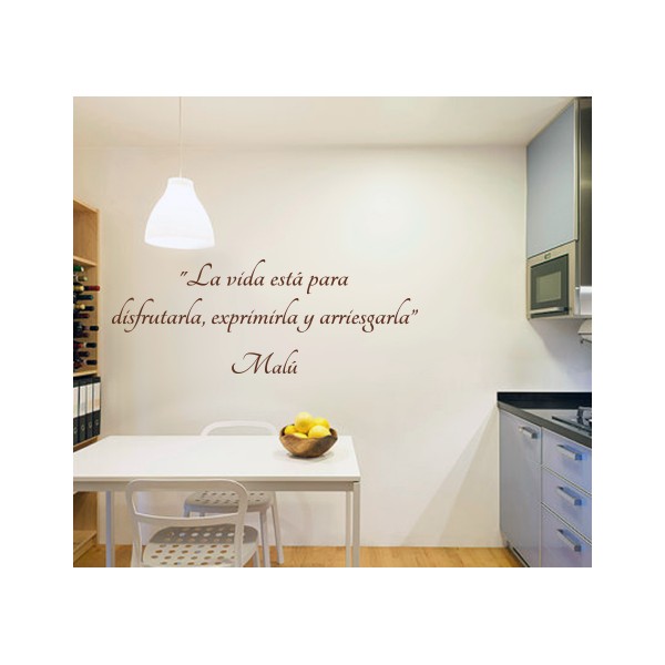 Vinilos con frase "La vida está para disfrutarla, exprimirla y arriesgarla" de Malú, para decoración de interiores y paredes, recomendado para superficies lisas. Son muy sencillos de colocar, y la colocación es muy limpia y rápida.