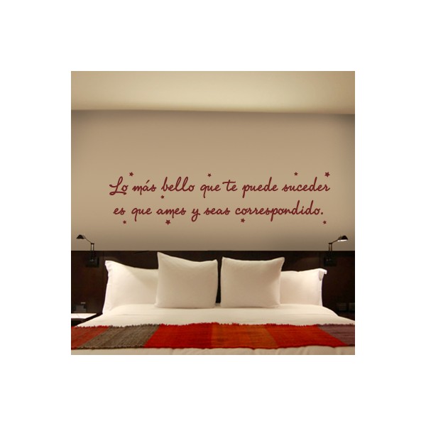 Vinilos con frase "Lo más bello que te puede suceder es que ames y seas correspondido.", con estrellas, para decoración de interiores y paredes, recomendado para superficies lisas. Son muy sencillos de colocar, y la colocación es muy limpia y rápida.