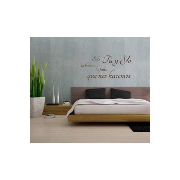 Vinilos con frase "Sólo Tú y Yo sabemos la falta que nos hacemos", para decoración de interiores y paredes, recomendado para superficies lisas. Son muy sencillos de colocar, y la colocación es muy limpia y rápida.