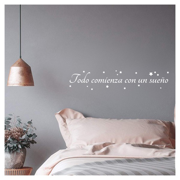 Con los vinilos de texto con la frase "Todo comienza con un sueño" puedes añadir una frase original y personal a tu pared y crear un ambiente único y diferente.