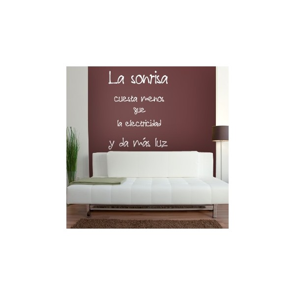 Vinilos decorativos con texto con la frase "La sonrisa cuesta menos que la electricidad y da más luz" para decoracion de interiores y paredes, recomendado para superficies lisas. Son muy sencillos de colocar, y la colocación es muy limpia y rápida.