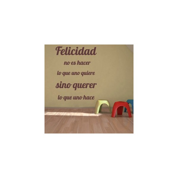 Vinilos decorativos con texto con la frase "Felicidad no es hacer lo que uno quiere sino querer lo que uno hace" para decoracion de interiores y paredes, recomendado para superficies lisas. Son muy sencillos de colocar, y la colocación es muy limpia y rápida.