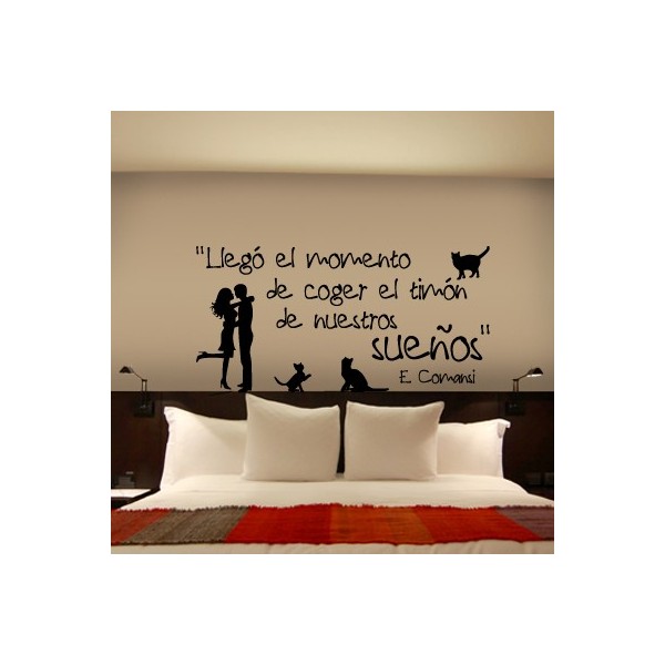 Vinilos decorativos con textos con frase "Llegó el momento de coger el timón de nuestros sueños" E. Comansi, con la silueta de un chico, una chica y tres gatitos para decoración de interiores y paredes, recomendado para superficies lisas. Son muy sencillos de colocar, y la colocación es muy limpia y rápida.