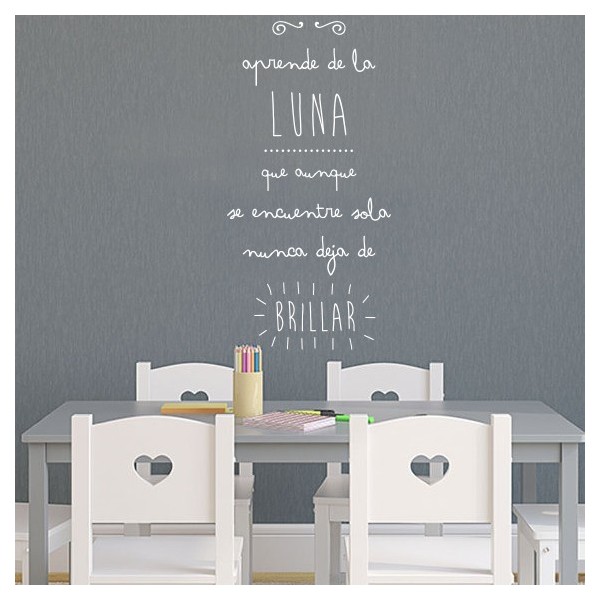 Vinilo de texto con la frase "Aprende de la luna que aunque se encuentre sola nunca deja de brillar", para decoración de interiores y paredes, recomendado para superficies lisas. Son muy sencillos de colocar, y la colocación es muy limpia y rápida.