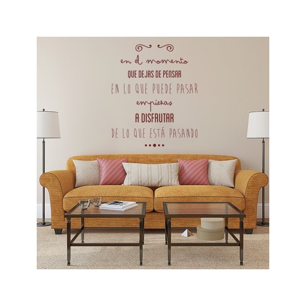 Vinilo de texto con la frase "En el momento que dejas de pensar en lo que puede pasar, empiezas a disfrutar de lo que está pasando", para decoración de interiores y paredes, recomendado para superficies lisas. Son muy sencillos de colocar, y la colocación es muy limpia y rápida.
