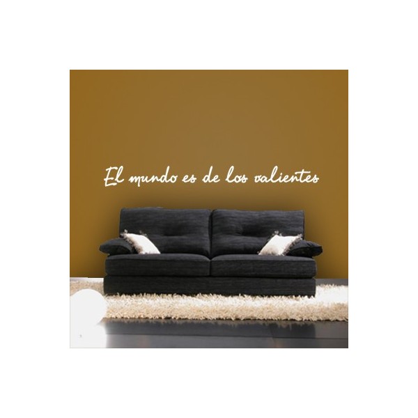 Vinilo de texto con la frase "El mundo es de los valientes", para decoración de interiores y paredes, recomendado para superficies lisas. Son muy sencillos de colocar, y la colocación es muy limpia y rápida.