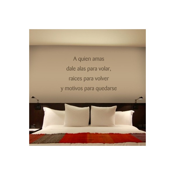 Los vinilos decorativos de textos "A quien amas dale alas para volar, raices para volver y motivos para quedarse" son una muy buena opción para personalizar tus paredes y añadir mensajes, ideas, frases célebres o poemas y darle un toque especial al ambiente que te rodea, en este caso, con una frase personalizada muy especial.