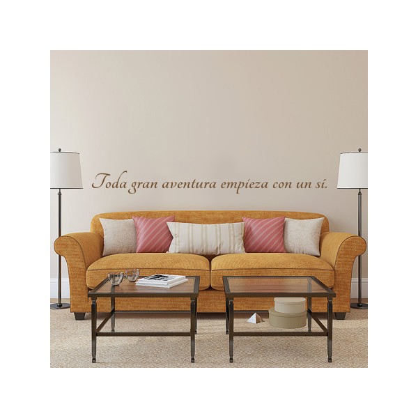 Vinilos decorativos de texto con frase: "Toda gran aventura empieza con un sí" para decoración. Recomendado para superficies lisas. Son muy sencillos de colocar, y la colocación es muy limpia y rápida.