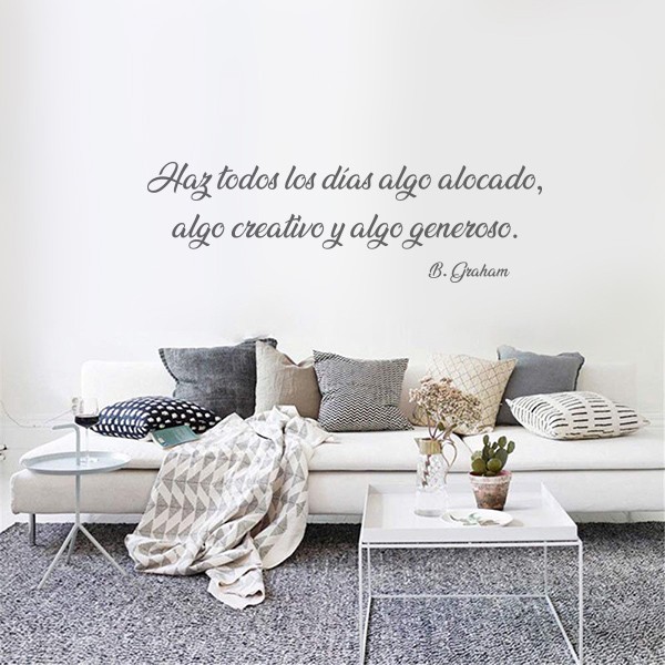 Los vinilos decorativos con frase "Haz todos los días algo alocado, algo creativo y algo generoso" de B. Graham, son una muy buena opción para personalizar tus paredes y añadir mensajes, ideas, frases célebres o poemas y darle un toque especial al ambiente que te rodea.