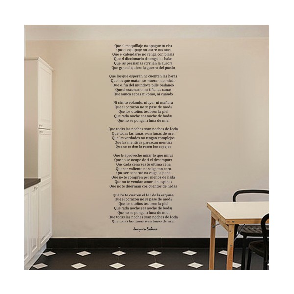 Los vinilos decorativos de textos con canción de Sabina, son una muy buena opción para personalizar tus paredes y añadir mensajes, ideas, frases célebres o poemas y darle un toque especial al ambiente que te rodea.