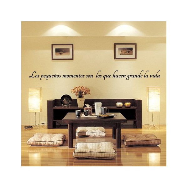 Vinilos decorativos de texto la frase "Los pequeños momentos son los que hacen grande la vida" escrita en una línea para decoracion de paredes de forma original, recomendado para superficies lisas. Son muy sencillos de colocar, y la colocación es muy limpia y rápida.